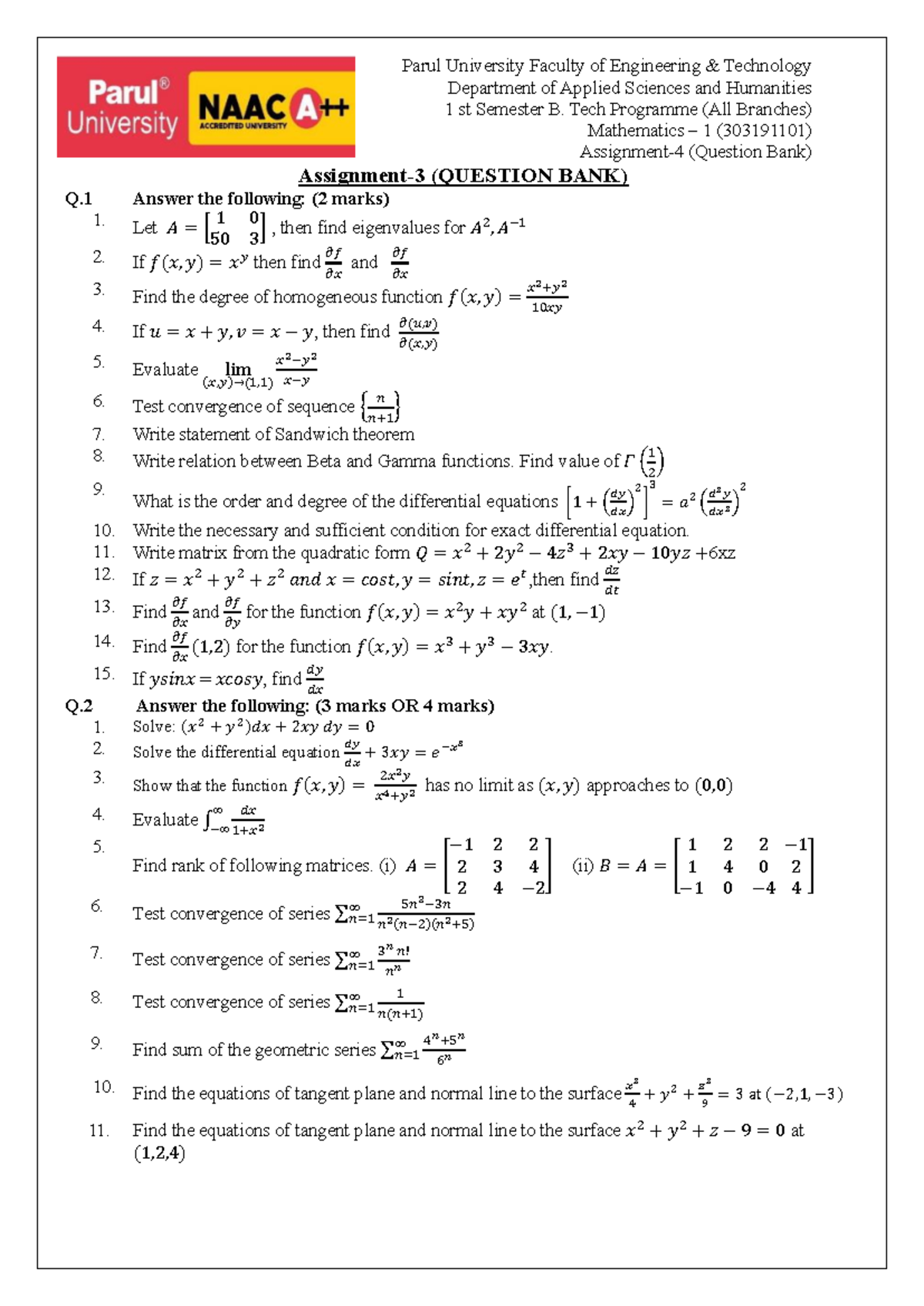 Mathematics - 1 (303191101) Assignment 4 Question Bank for B.Tech 1st ...