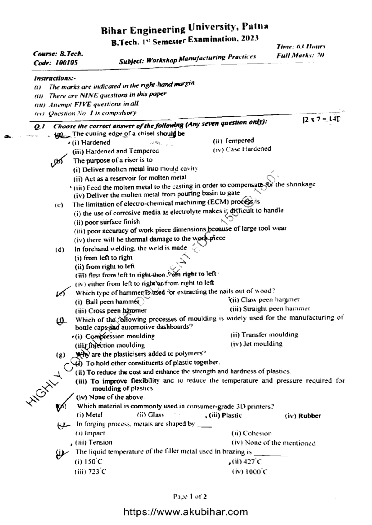 B.Tech 1st Sem Workshop Manufacturing Practices Exam 100105 2023 - Studocu