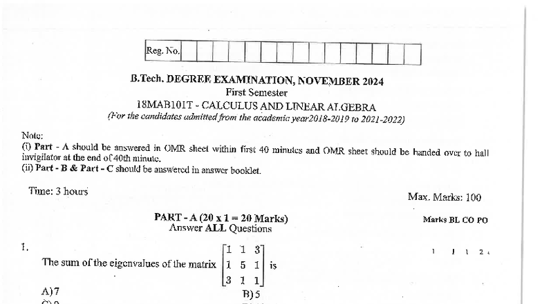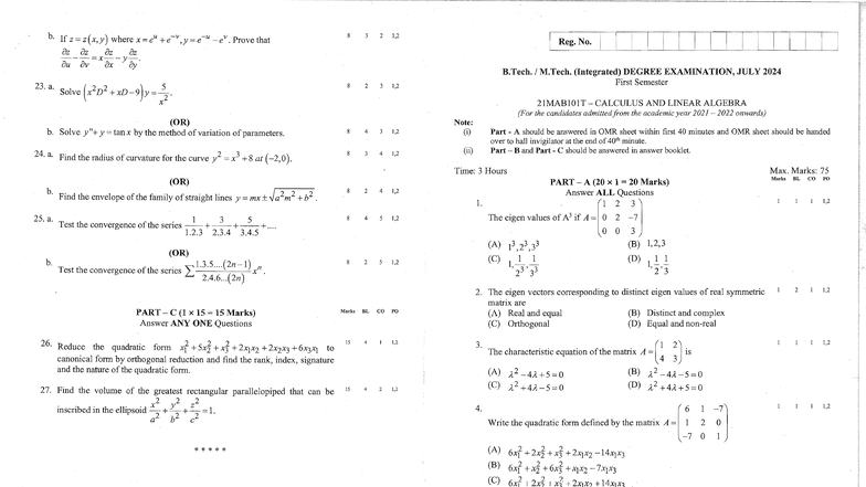 B.Tech. 1st Sem Exam: Calculus & Linear Algebra - Nov 2024 - Studocu