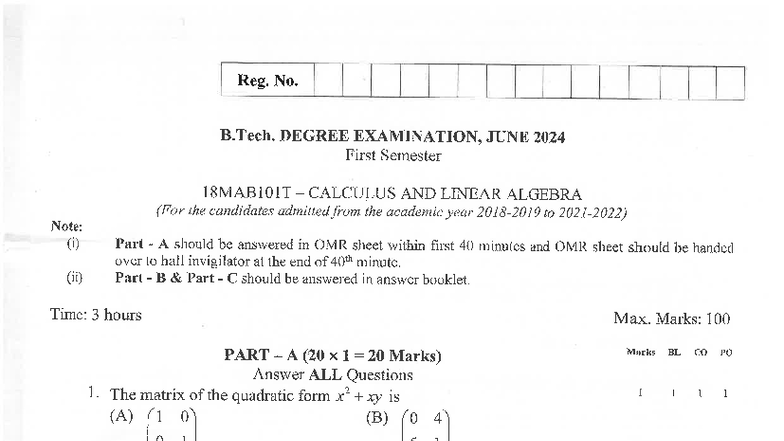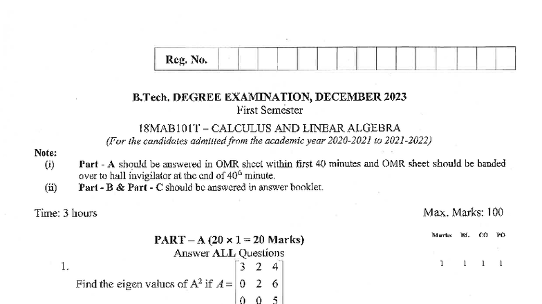 B.Tech 1st Sem 18MAB101T Calculus & Linear Algebra Exam Paper, June ...