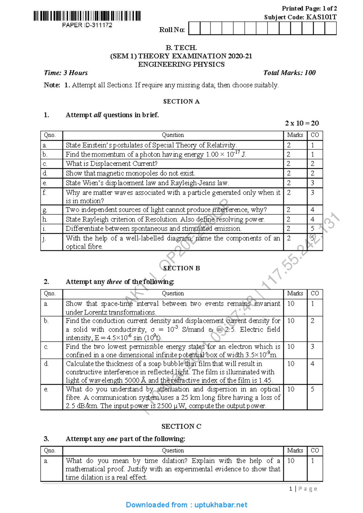 EAS101 B.Tech 1st Sem Engineering Physics Theory Exam 2020 - Studocu