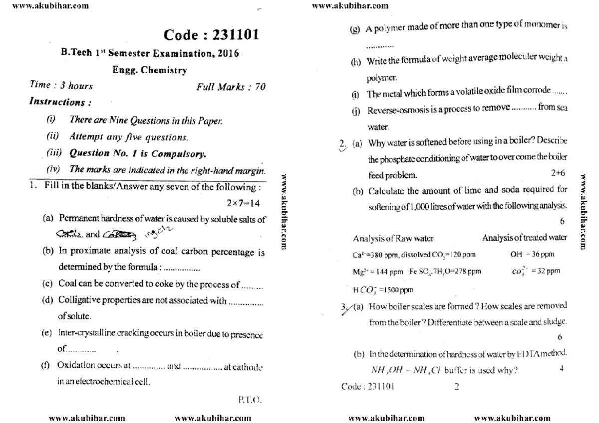 B.Tech 1st Sem Engg. Chemistry Exam 231101 - 2016 Paper - Studocu