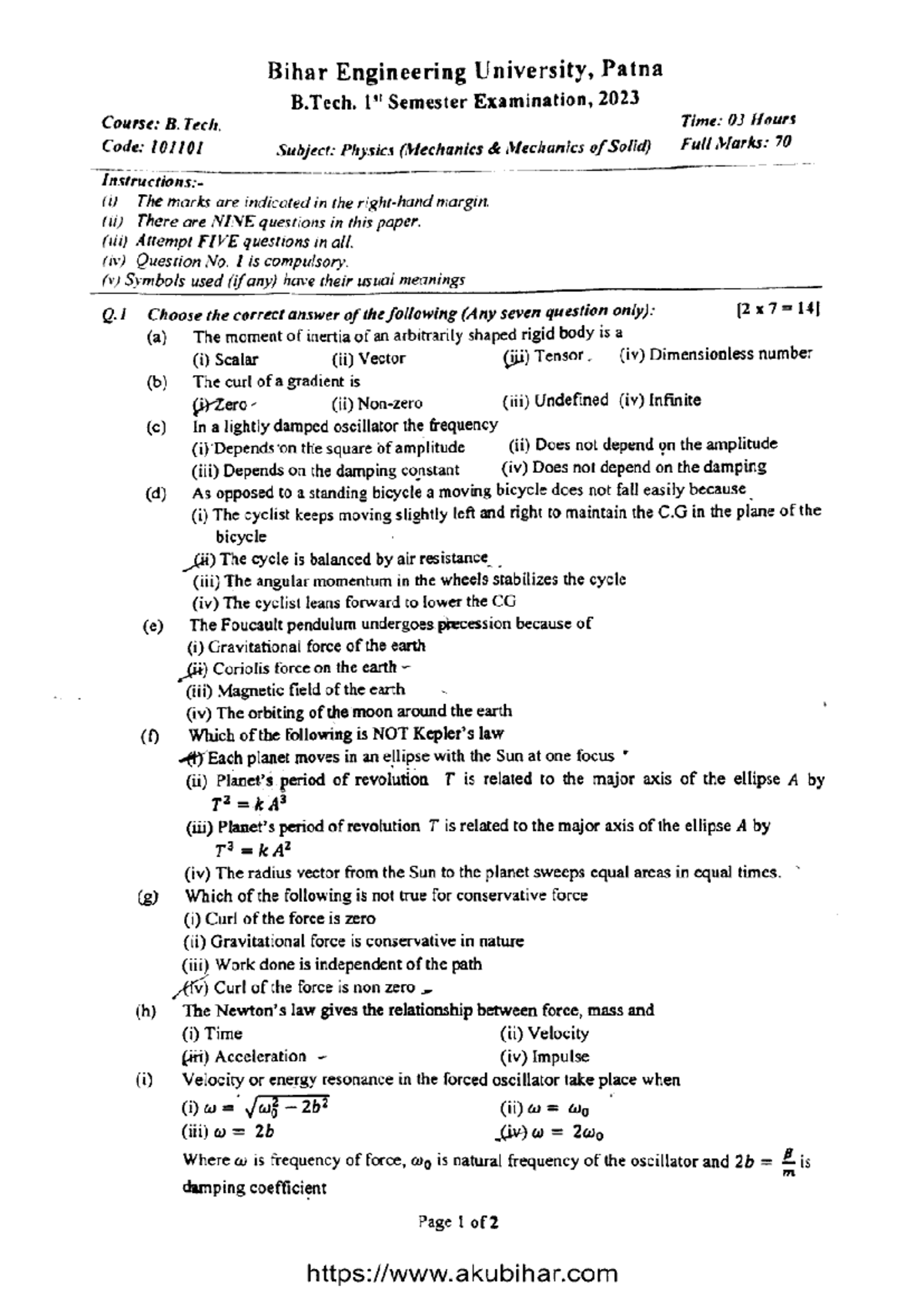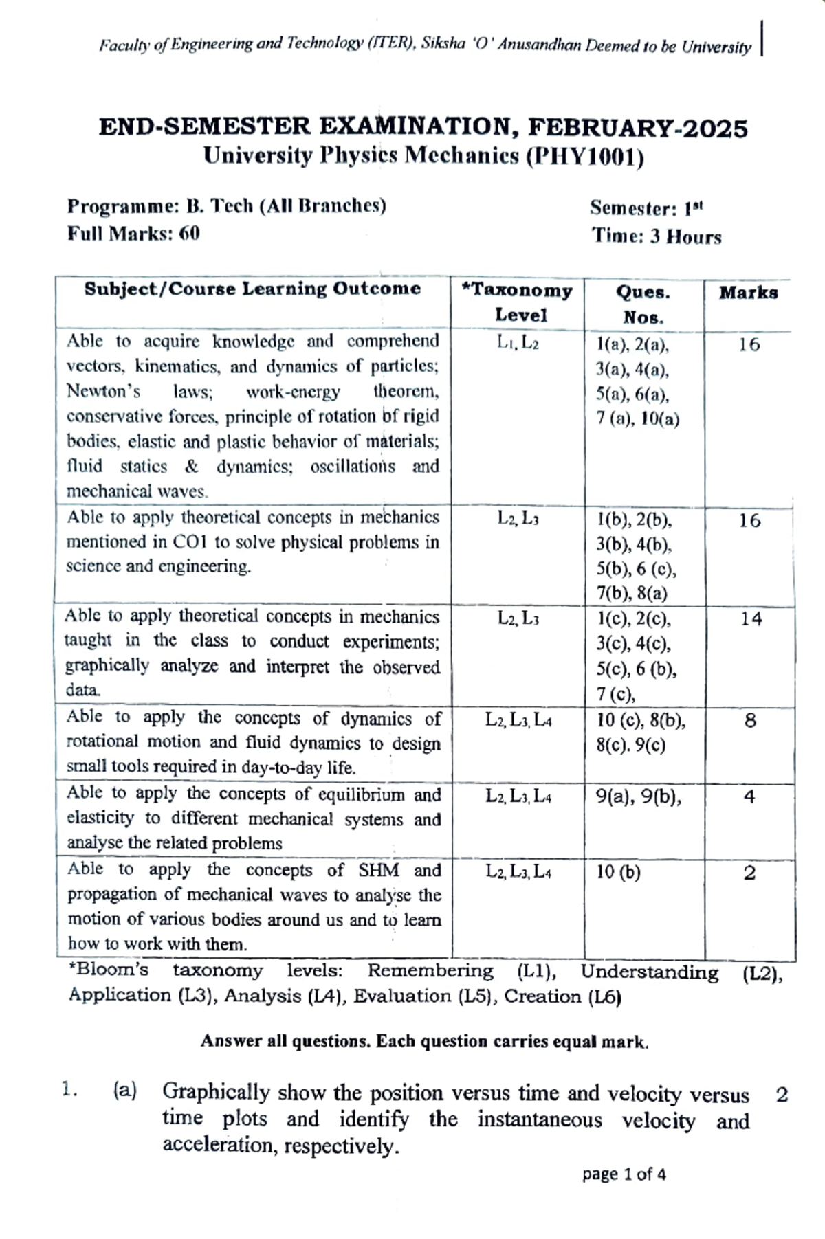 PHY1001: B. Tech 1st Sem Mechanics Exam Paper - Full Marks 60 - Studocu