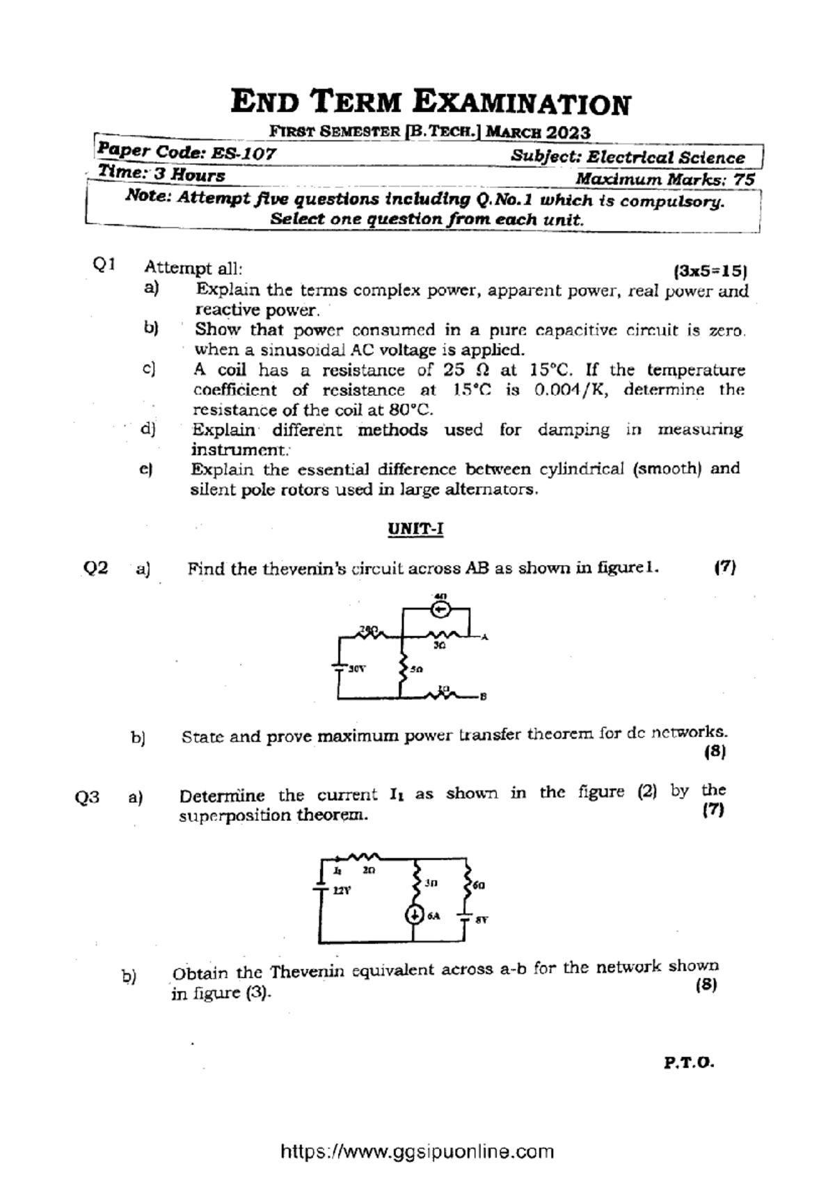 B.Tech 1st Sem Electrical Science ES 107 End Term Exam March 2023 - Studocu