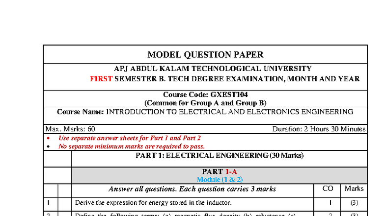GXEST104 Model Question Paper: Intro to EE & EC - B.Tech 1st Sem - Studocu