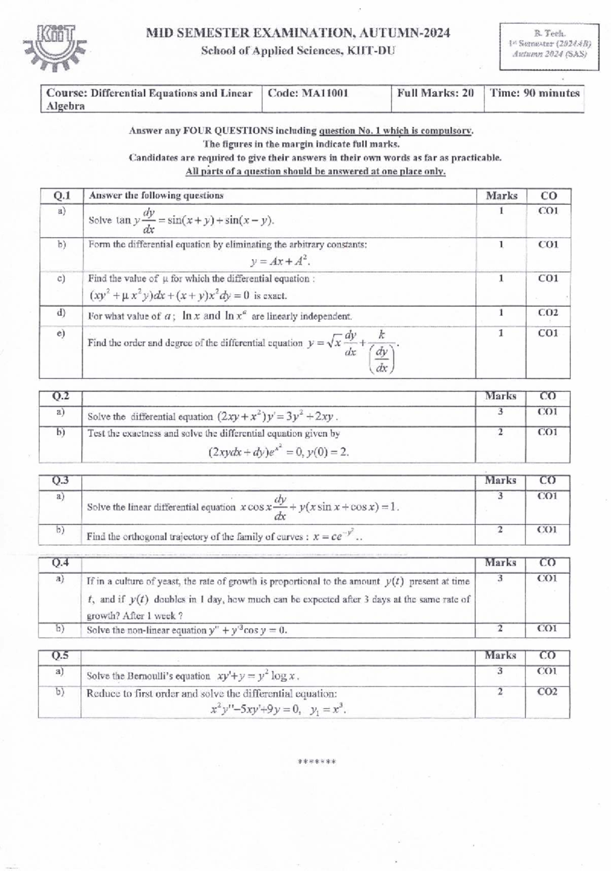 KiiT MID SEM EXAM, B. Tech 1st Sem (2024AB) MA11001 - Studocu
