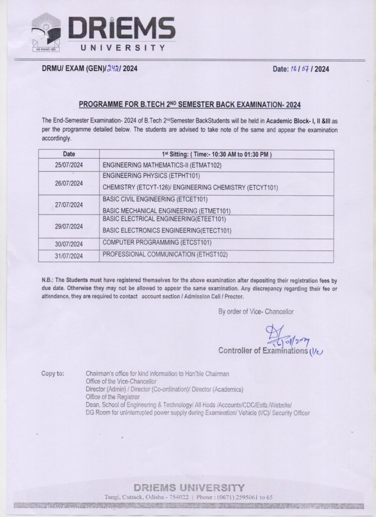 Programme For B.Tech 8th Semester Special Examination 2024 - DRIEMS ...