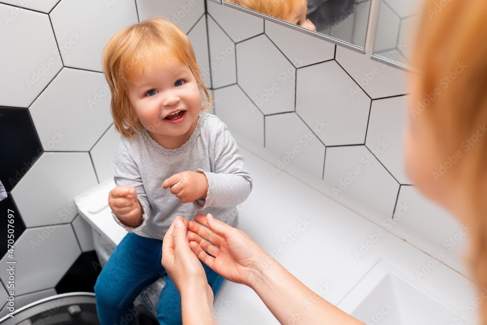 Smiling little girl is sitting on the countertop in the bathroom and ...