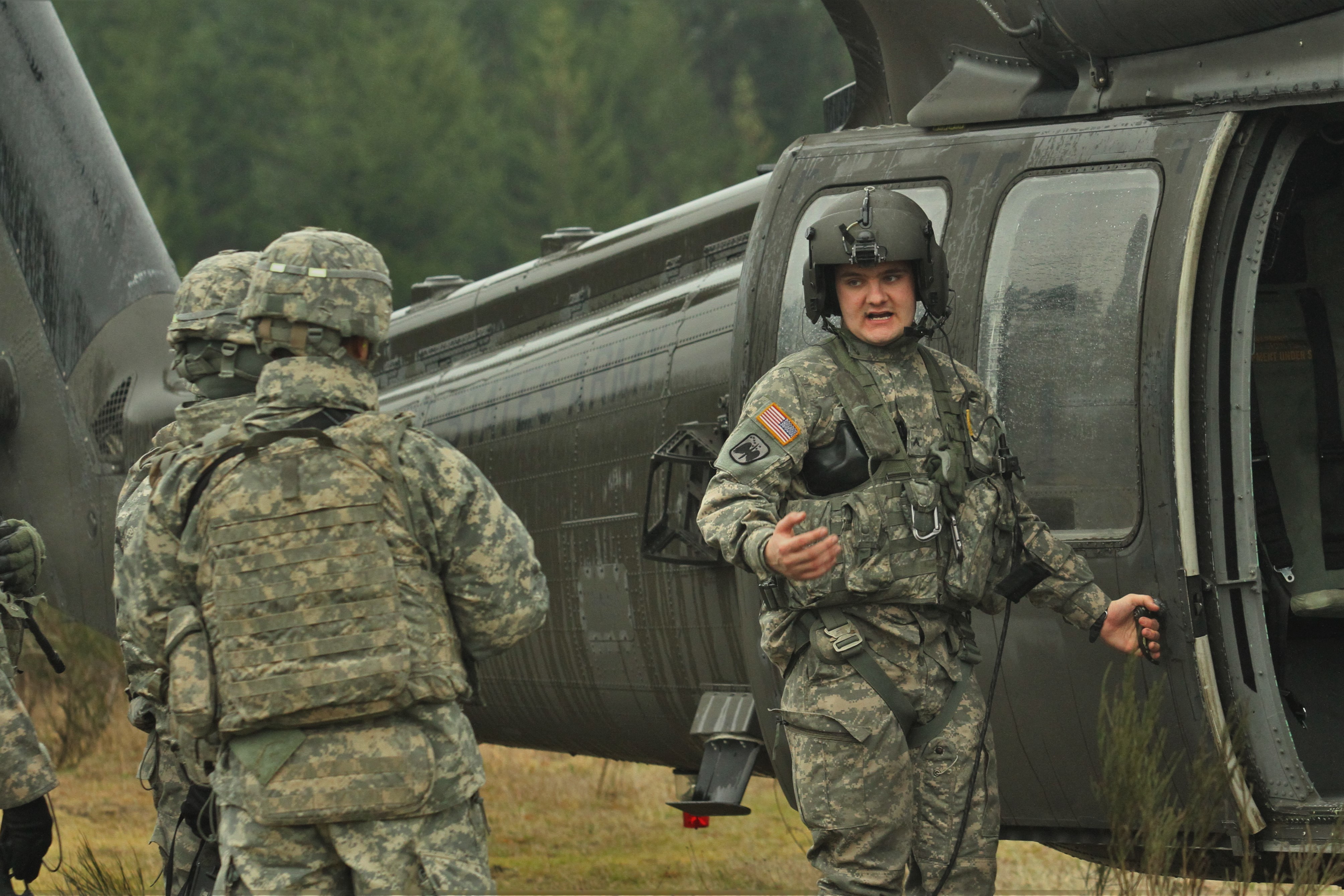 An Army crew chief prepares a UH-60 Black Hawk helicopter for a mission ...