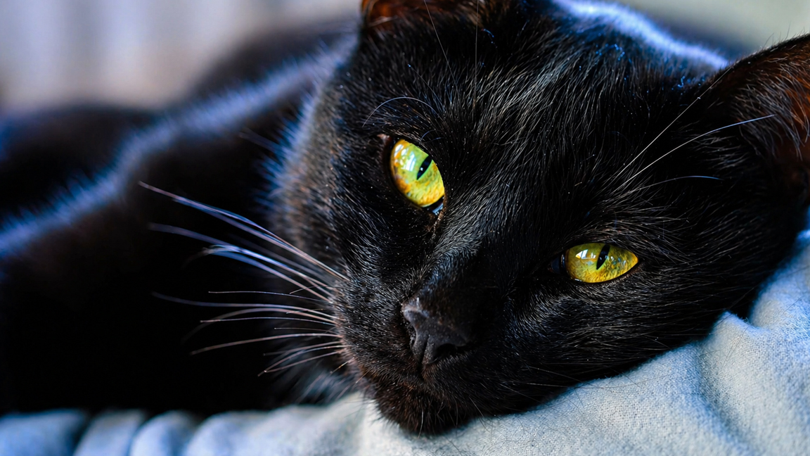 Relaxed black cat with sharp yellow eye focus