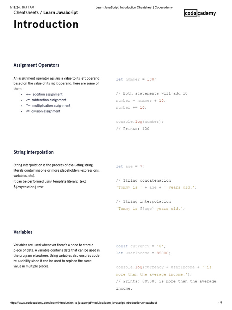 Learn JavaScript - Introduction Cheatsheet - Codecademy | PDF | Java ...