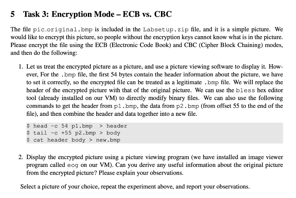 Solved 5 Task 3: Encryption Mode - ECB vs. CBC The file | Chegg.com