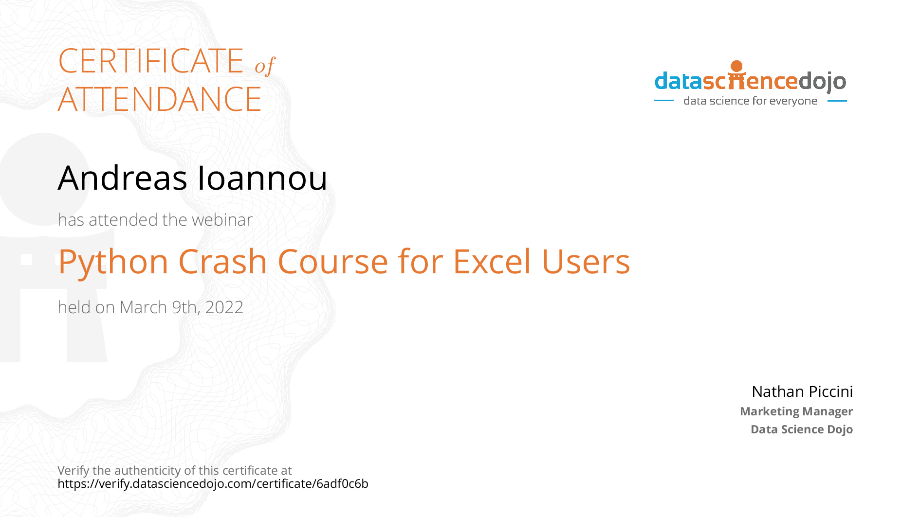 Andreas Ioannou's Certificate | Data Science Dojo
