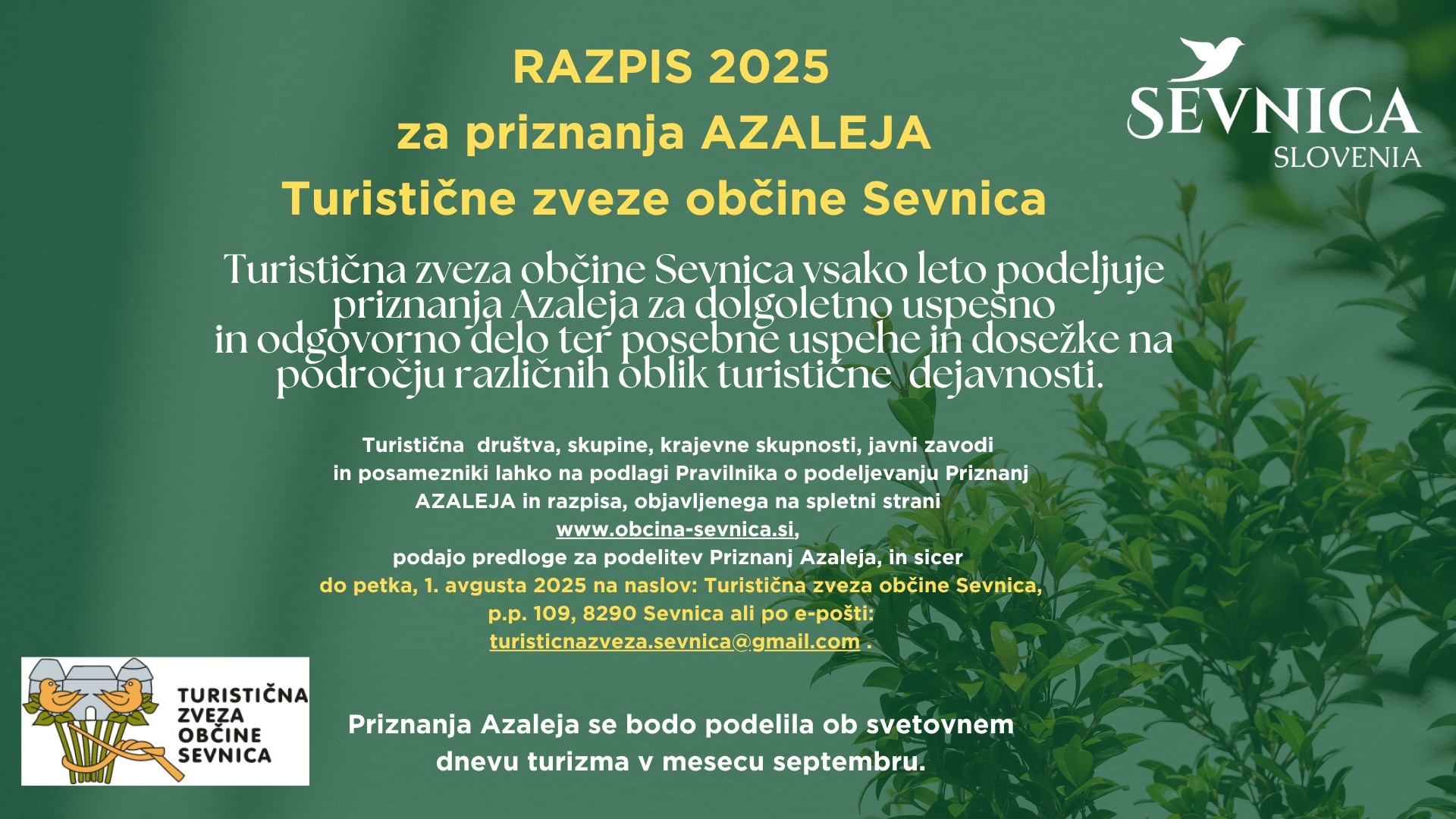RAZPIS, priznanja AZALEJA Turistične zveze občine Sevnica za leto 2024 ...