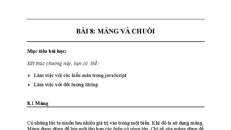 BÀI 8: MẢNG VÀ CHUỖI TRONG JAVASCRIPT - TÀI LIỆU HỌC TẬP - Studocu
