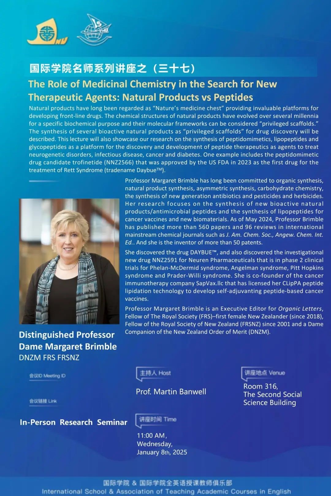 名师讲座预告 | 药物化学在寻找新治疗剂中的作用:天然产物与肽药物