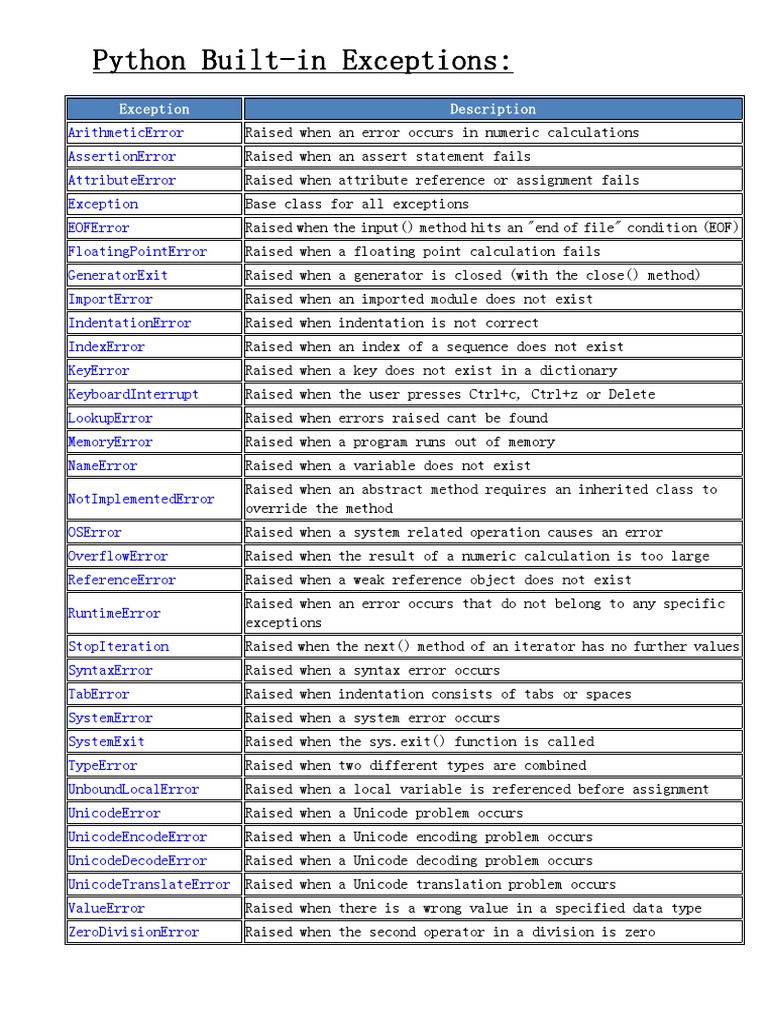 Built-In Exceptions in Python | PDF | Python (Programming Language ...