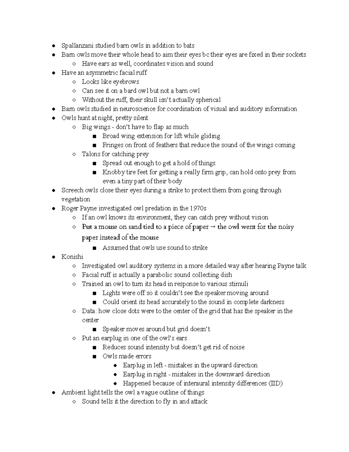 Lecture 7 Notes (9 17) - Prof. Ken Catania - Spallanzani studied barn ...