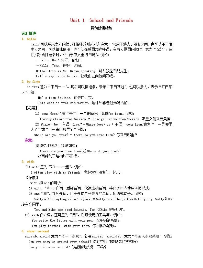 冀教版七年级英语上册Unit 1 School and friends 词句精讲精练(含答案)-21世纪教育网