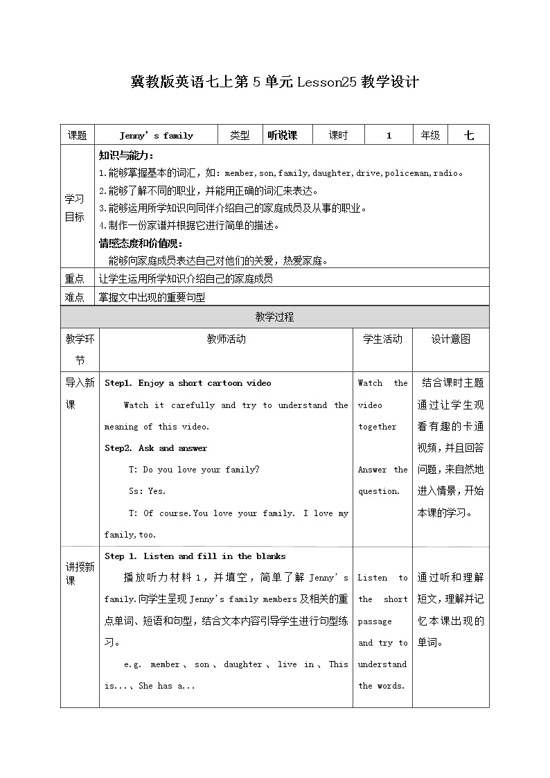 初中英语冀教版七年级上册Lesson 25 Jenny's Family教学设计-教习网|教案下载