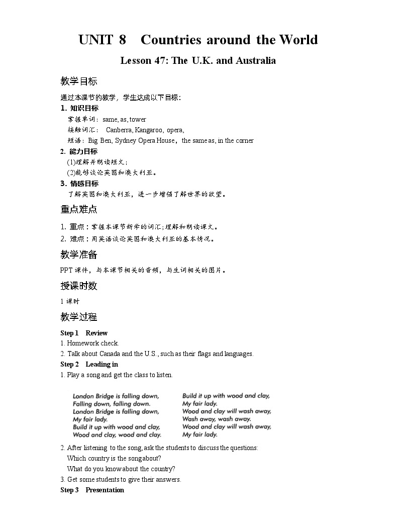 冀教版英语 七年级上册Unit 8 Countries around the world Lesson 47 The U.K. and ...