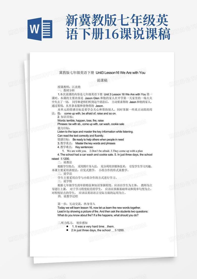 新冀教版七年级英语下册16课说课稿-Word模板下载_编号lwnmwnpe_熊猫办公