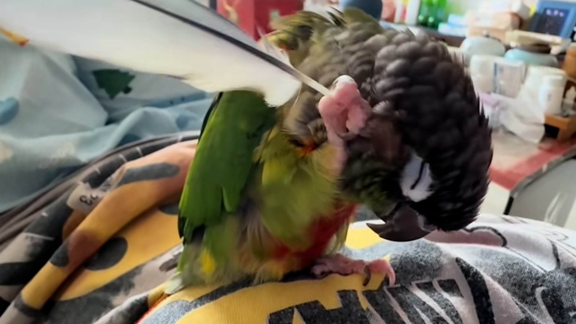 Parrot uses feather to scratch its head in Liaoning, China