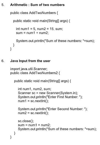 Based on this image's title: “Basic programs java - Sum of two numbers public class JavaExample ...”