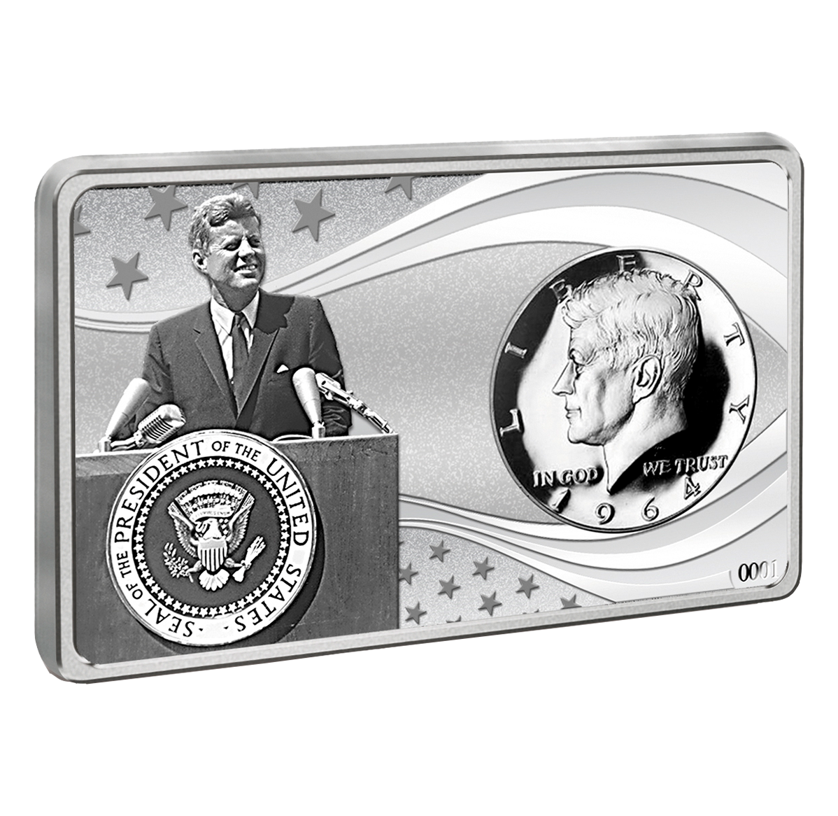 Based on this image's title: “John F. Kennedy 1000-Gram Sterling Silver Memorial Metal | #1953662477”