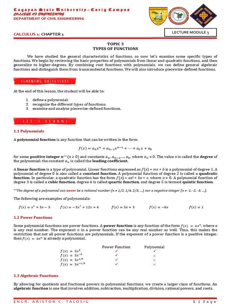 Types of Functions in Calculus 1 | PDF | Polynomial | Trigonometric ...