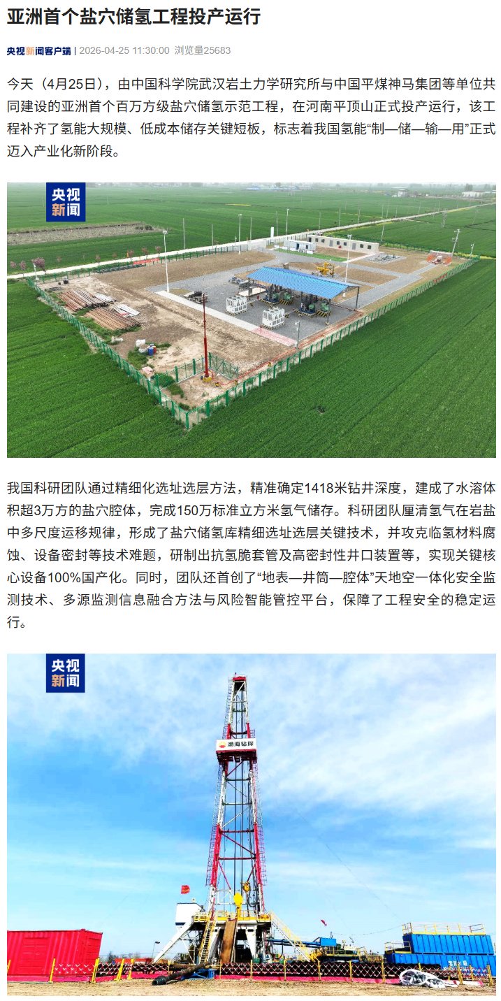 亚洲首个盐穴储氢工程在河南平顶山投产运行,核心设备 100% 国产化|平顶山市|河南省|氢能|能源|体系_手机新浪网