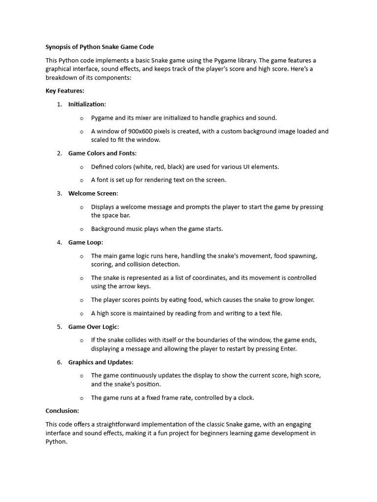 Synopsis of Python Snake Game Code | PDF | Python (Programming Language ...