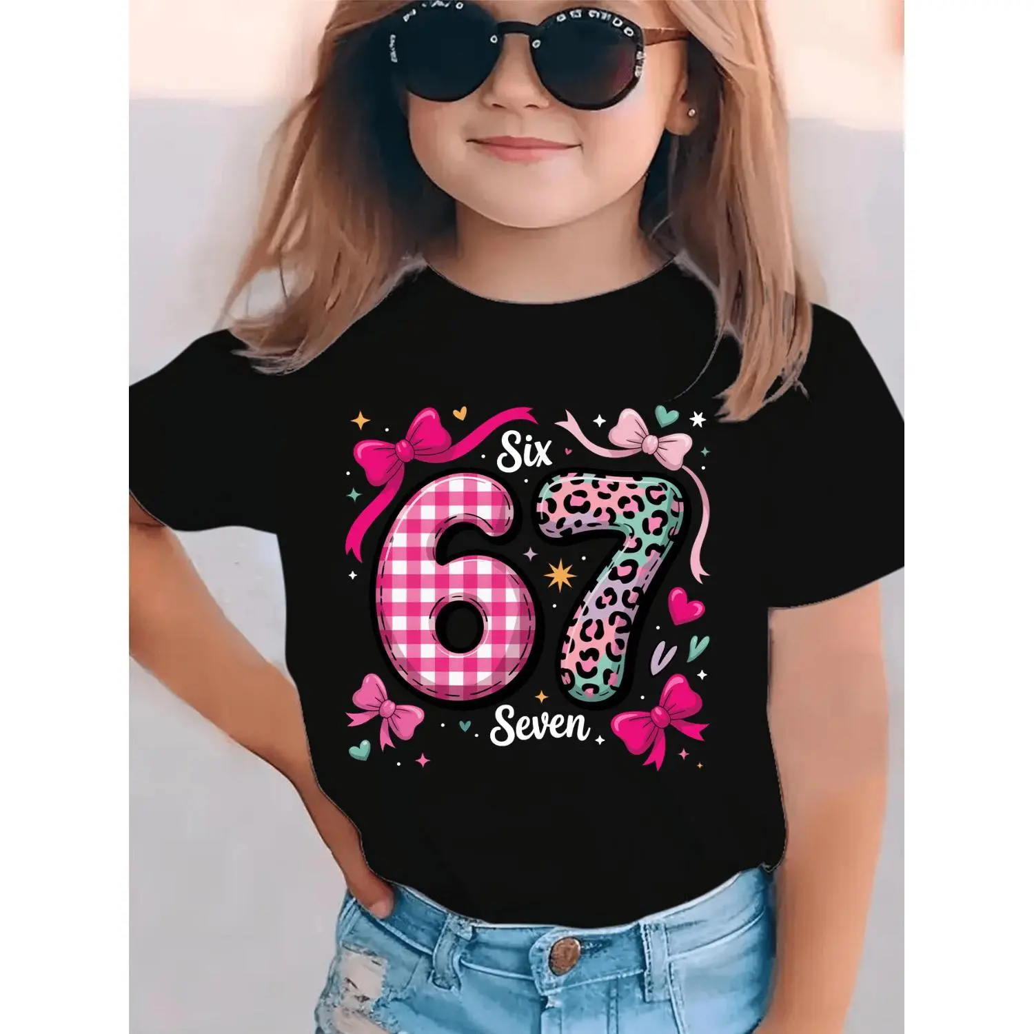 Casual Short Sleeve Girl TShirt with Plaid Leopard Print Number 67 Bows ...