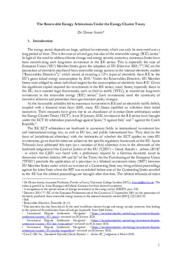 (PDF) The Renewable Energy Arbitrations under the Energy Charter Treaty