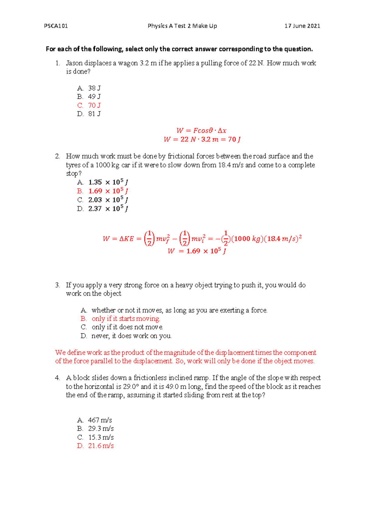 PSCA101 Physics A Test 2 Make Up - June 2021 Solutions - Studocu