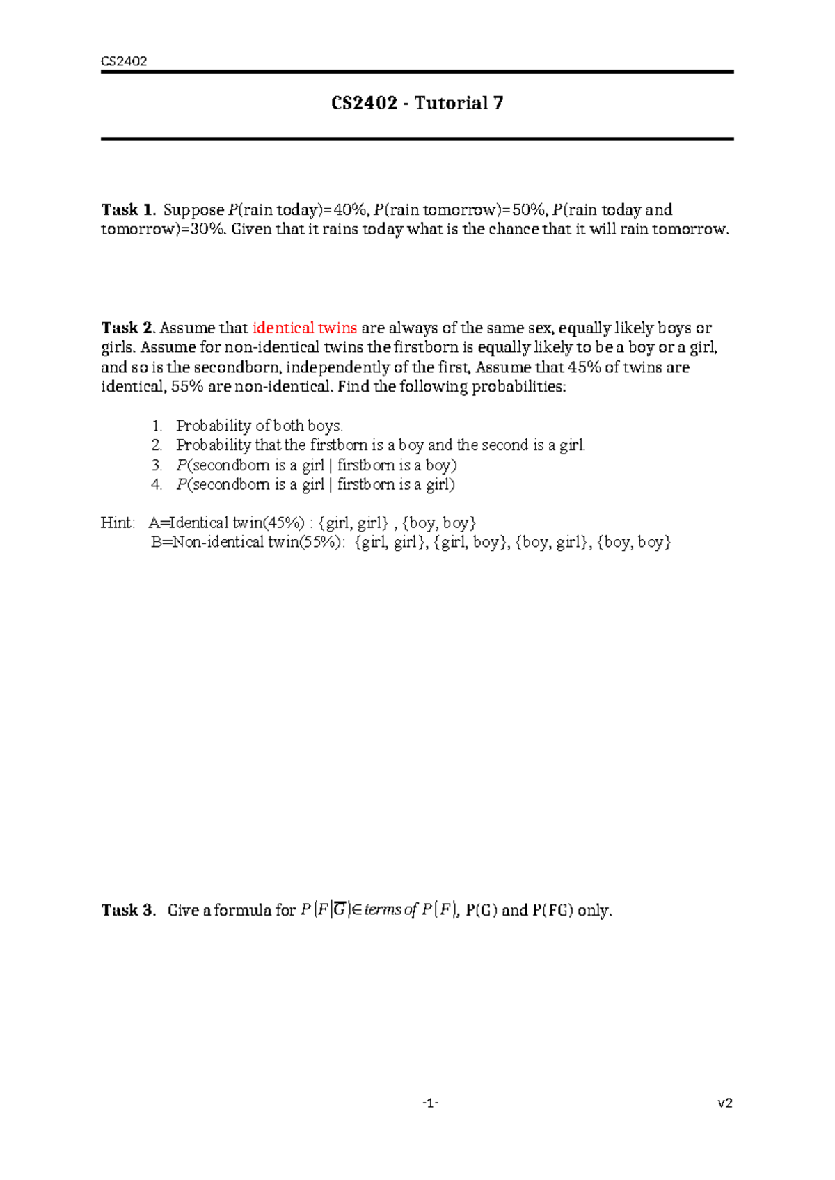 CS2402 Tutorial 7: Probability Tasks and Formulas - Studocu