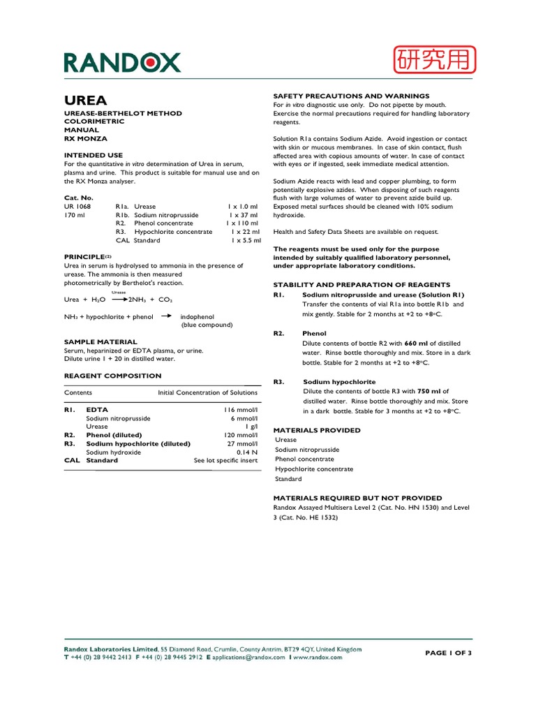 In Vitro Diagnostic Use Only. Do Not Pipette by Mouth.: Urease 2 3 2 o ...