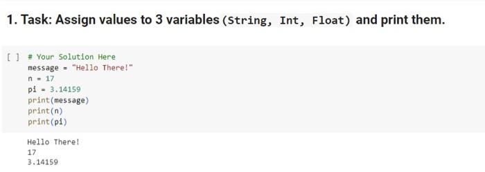 Solved 1. Task: Assign values to 3 variables (String, Int, | Chegg.com