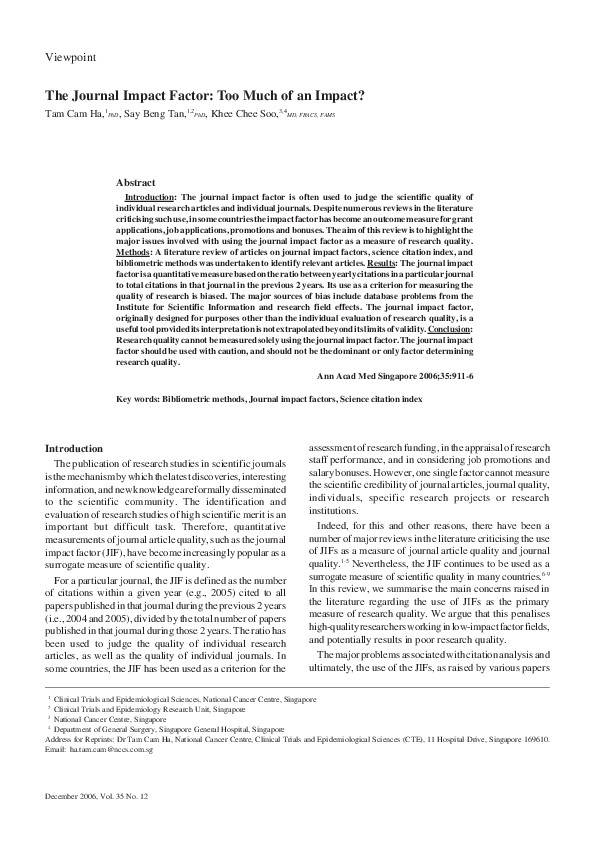 (PDF) The Journal Impact Factor: Too Much of an Impact?