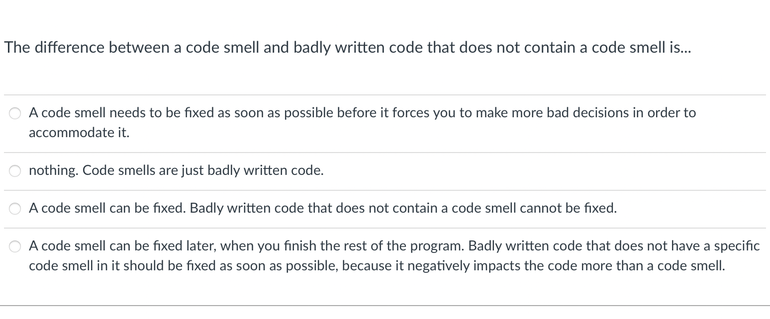 Solved he difference between a code smell and badly written | Chegg.com