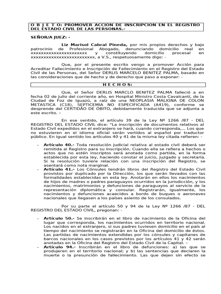 Escrito de Inscripción de Fallecimiento - Derlis Marcelo Benitez Palma ...