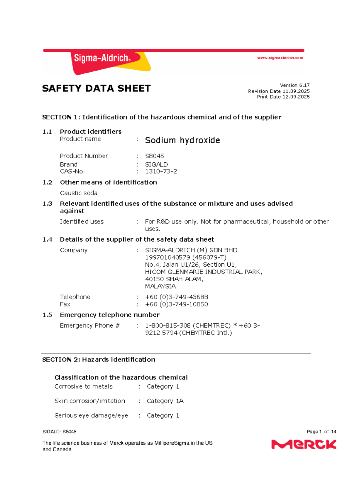SDS for Sodium Hydroxide (S8045) - Version 6.17 - Studocu