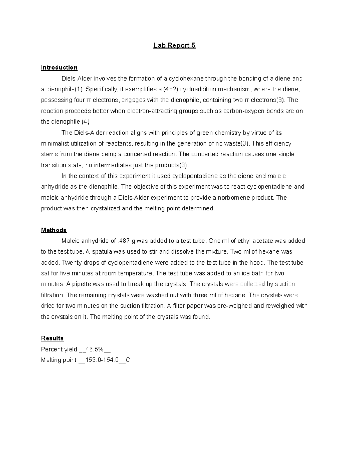 Lab Report 5 - Diels-Alder Cycloaddition: Reaction & Analysis - Studocu