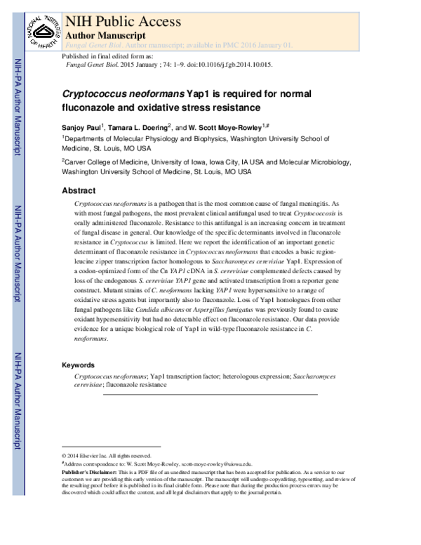 (PDF) Cryptococcus neoformans Yap1 is required for normal fluconazole ...