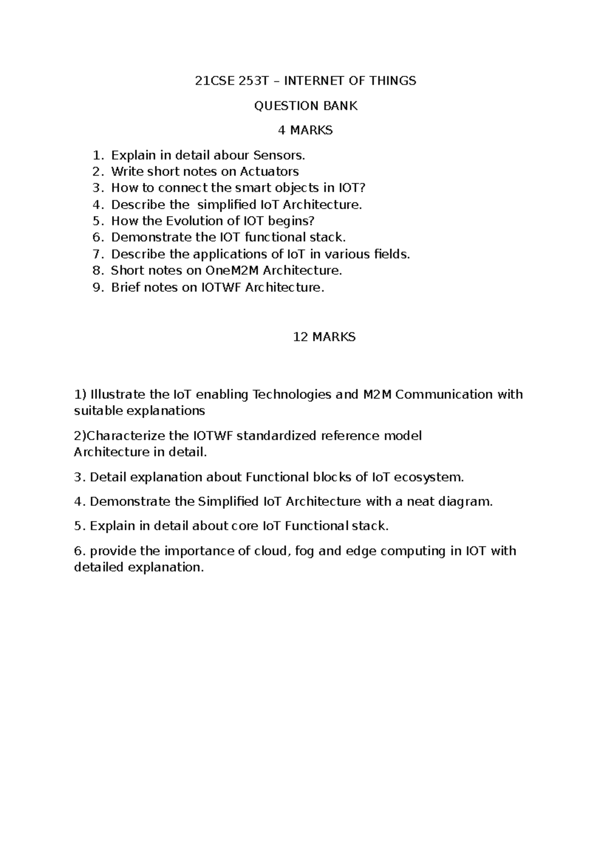 21CSE 253T IoT Question Bank: Key Concepts & Architectures - Studocu
