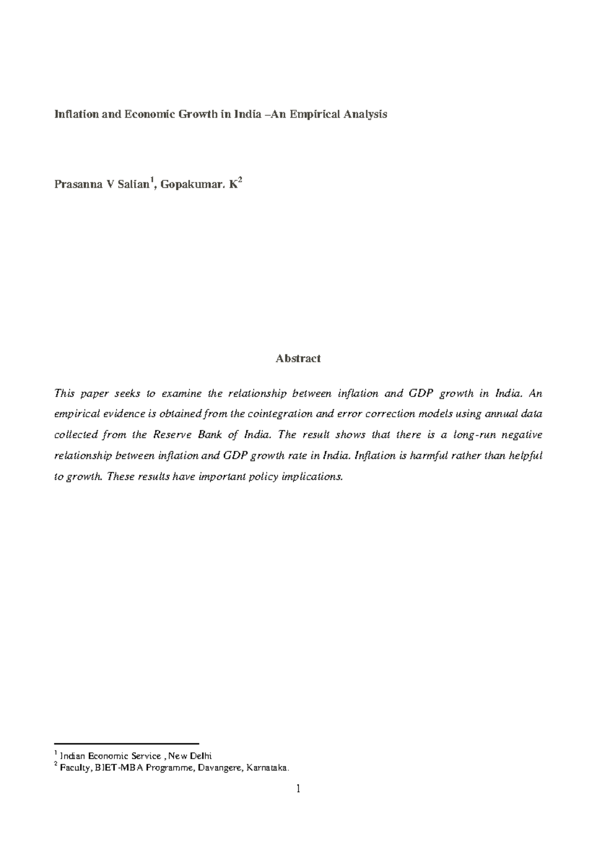 Inflation and Economic Growth in India: An Empirical Analysis (ECO 101 ...