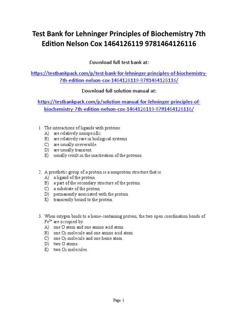 Test Bank - Lehninger Principles of Biochemistry, 7th Edition (Nelson ...