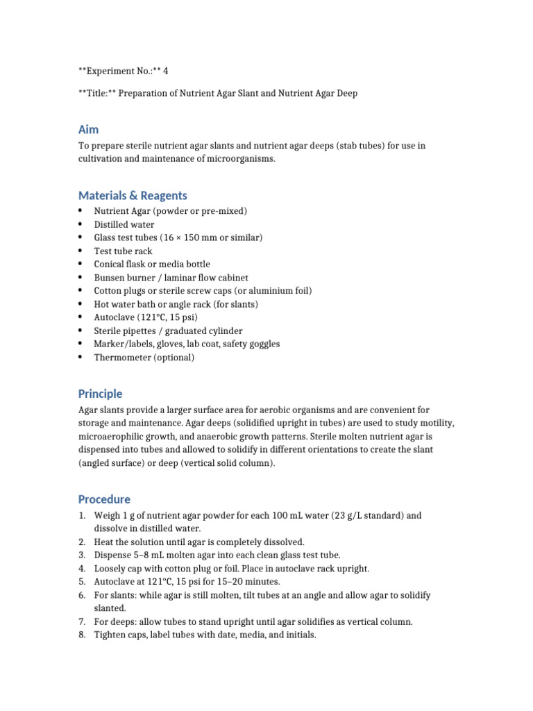 Agar Slant and Deep Preparation Guide | PDF