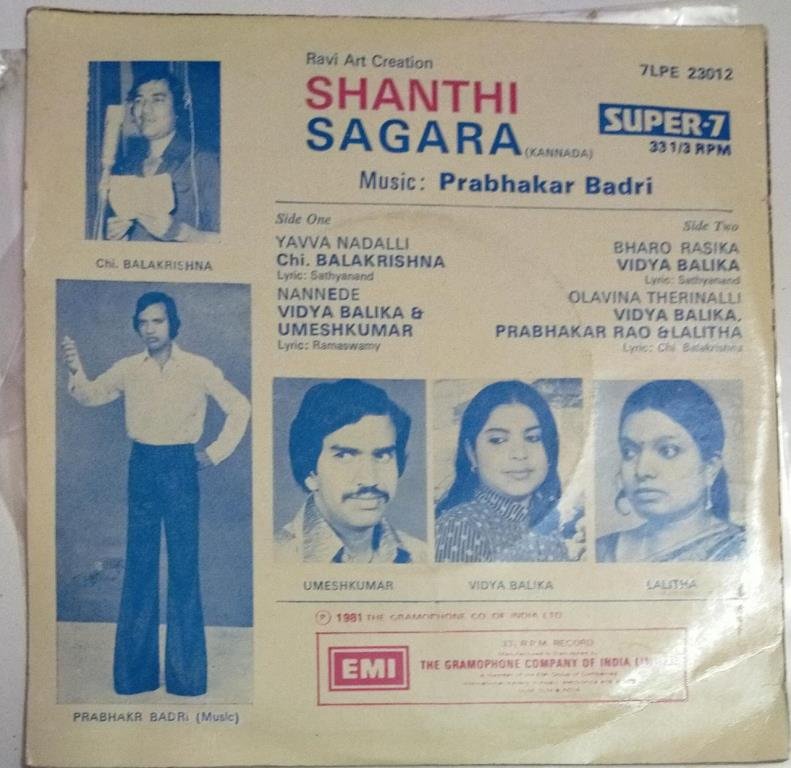 Shanthi Sagara Kannada Film EP Vinyl Record by Prabhakar Badri - MOSSYMART