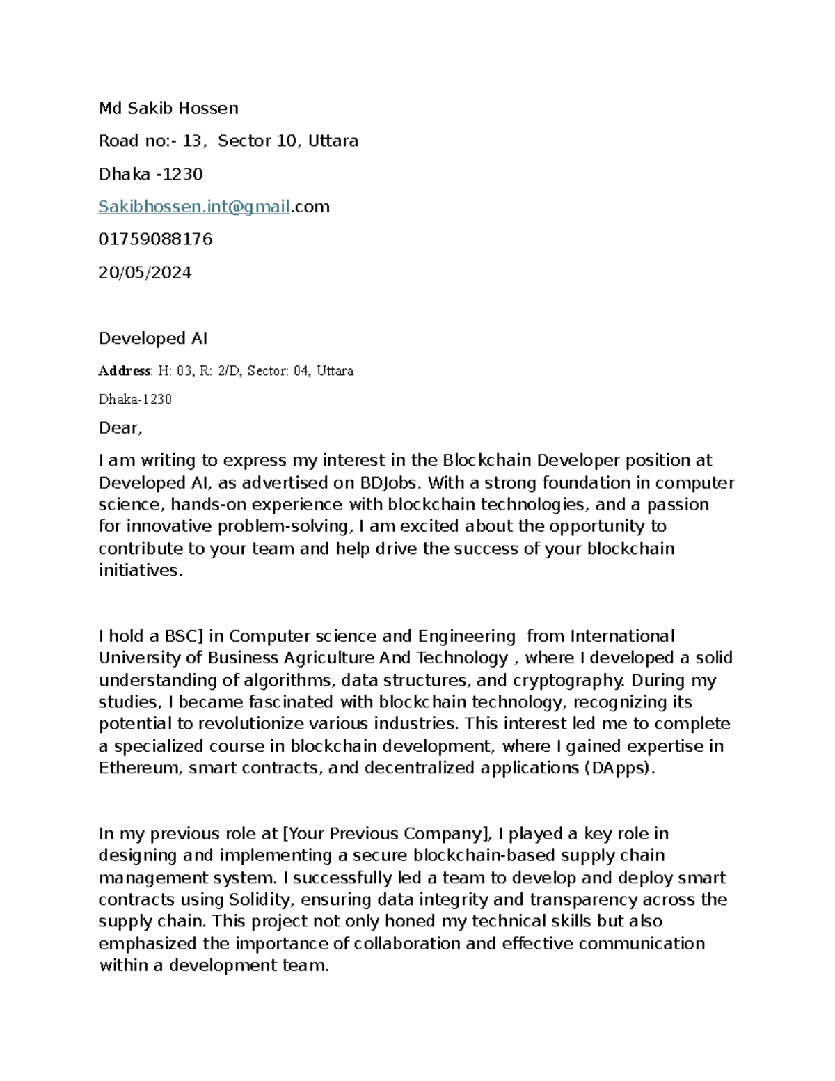 Sakib cover letter - Summary Programming in c++ - Md Sakib Hossen Road ...